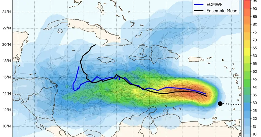 El meteorólogo aclaró que existen diversas proyecciones sobre la trayectoria del sistema: algunas lo ubican entrando directamente por República Dominicana, mientras otras lo desplazan hacia el norte del Caribe.