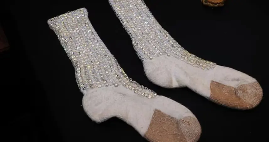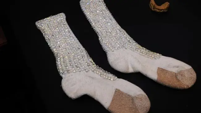 Bordado con cristales cuadrados brillantes, el calcetín fue enmarcado y acompañado del "pase de acceso a backstage de la época" del técnico, precisó por su parte el sitio internet de subastas Interencheres.