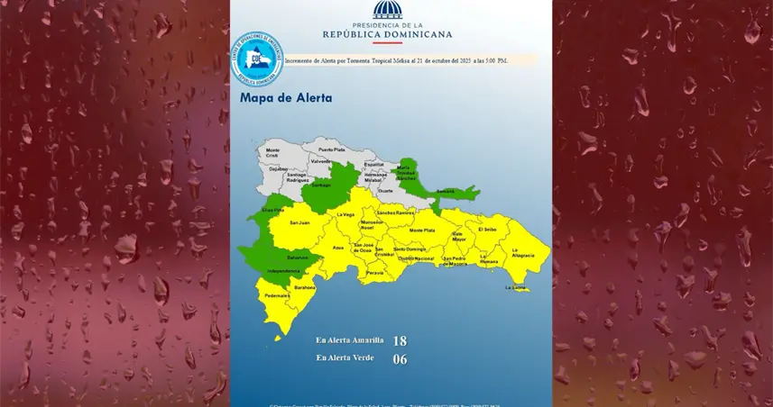Por su parte, las provincias en alerta verde incluyen María Trinidad Sánchez, Bahoruco, Samaná, Santiago, Independencia y Elías Piña.