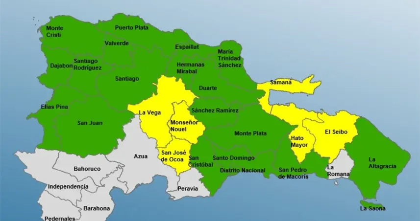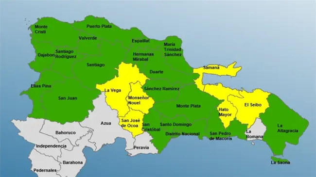 Provincias en alerta amarilla: Samaná, María Trinidad Sánchez, El Seibo, Hato Mayor, La Romana, y La Altagracia.