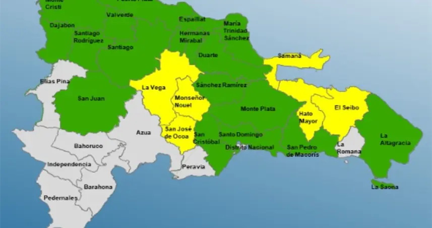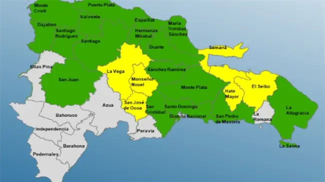 Santo Domingo.– El Centro de Operaciones de Emergencias (COE) informó que se mantienen 6 provincias en alerta amarilla y 18 en alerta verde, debido al riesgo de inundaciones repentinas urbanas y rurales, crecidas de ríos, arroyos y cañadas, así como deslizamientos de tierra.