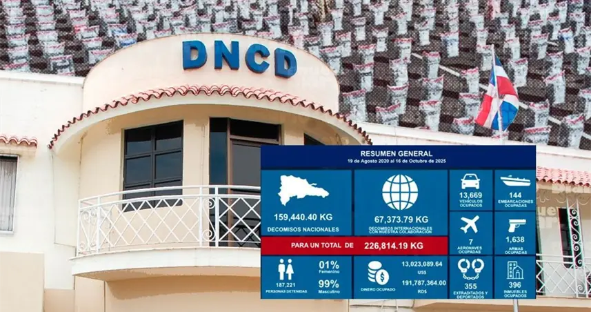 Santo Domingo.– La Dirección Nacional de Control de Drogas (DNCD) presentó este martes un balance general de los resultados obtenidos en la lucha contra el narcotráfico y el crimen organizado desde el 19 de agosto de 2020 hasta el 16 de octubre de 2025, período durante el cual informó se han ejecutado múltiples operativos con resultados contundentes.