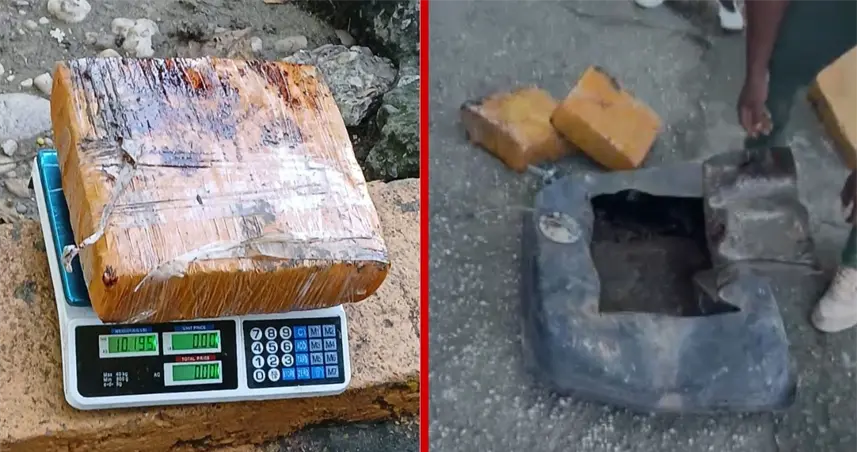 Durante la revisión, encontraron un tanque de combustible adaptado de forma clandestina, dentro del cual fueron encontradas dos pacas de un vegetal de color verde, envueltas en plástico color crema, presumiblemente marihuana, con un peso aproximado de 10.195 y 10.095 libras, para un total de alrededor de 20 libras ocupadas.