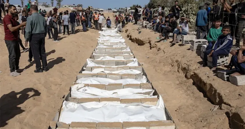 Gaza.– Los cuerpos de 54 gazatíes cuya identidad no se ha podido verificar debido al paso del tiempo y signos de desfiguración fueron enterrados este miércoles en una fosa común en un cementerio con zanjas en el centro de la Franja de Gaza.