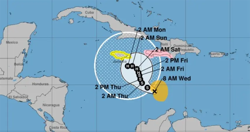 “Las condiciones de huracán son posibles en Haití a partir de la noche del jueves, mientras que Jamaica podría comenzar a experimentar condiciones de tormenta tropical entre jueves y viernes”, detalla el informe.