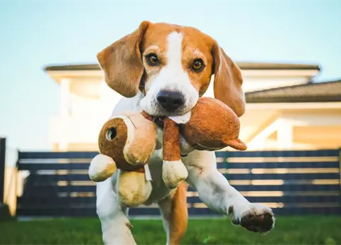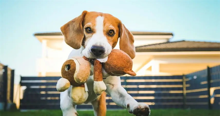 Perro con un juguete en la boca.
