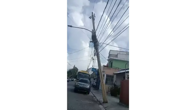 “Ese poste hay que resolverlo antes de que caiga encima de alguien. Los cables prácticamente están en el piso y los autobuses chocan con ellos cuando pasan”, advirtieron comunitarios, quienes hicieron un llamado urgente a las autoridades locales.